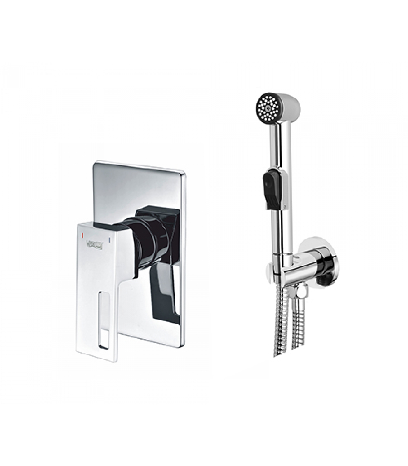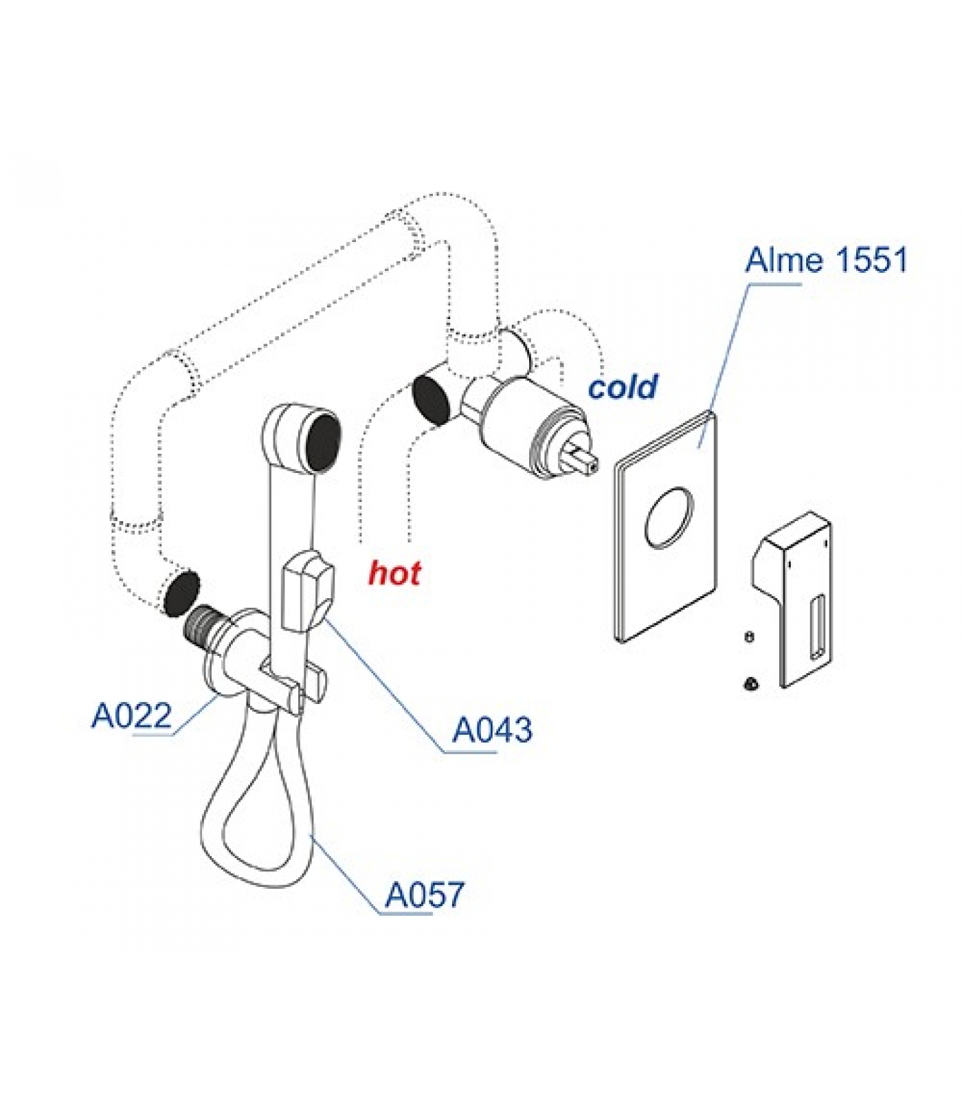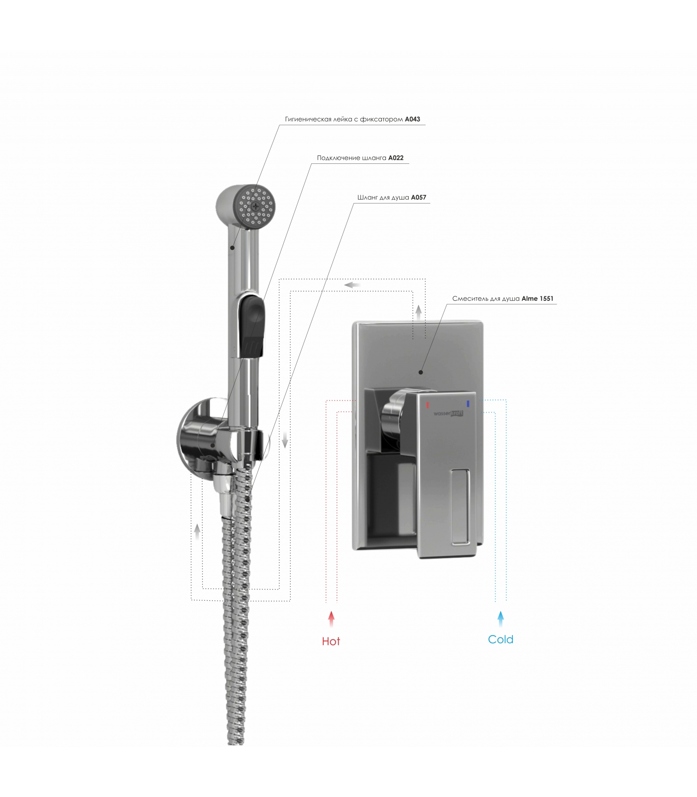 Смеситель для душа Alme 1551, Подключение шланга A022, Шланг для душа 1200 мм А057, Гигиеническая лейка с фиксатором A043