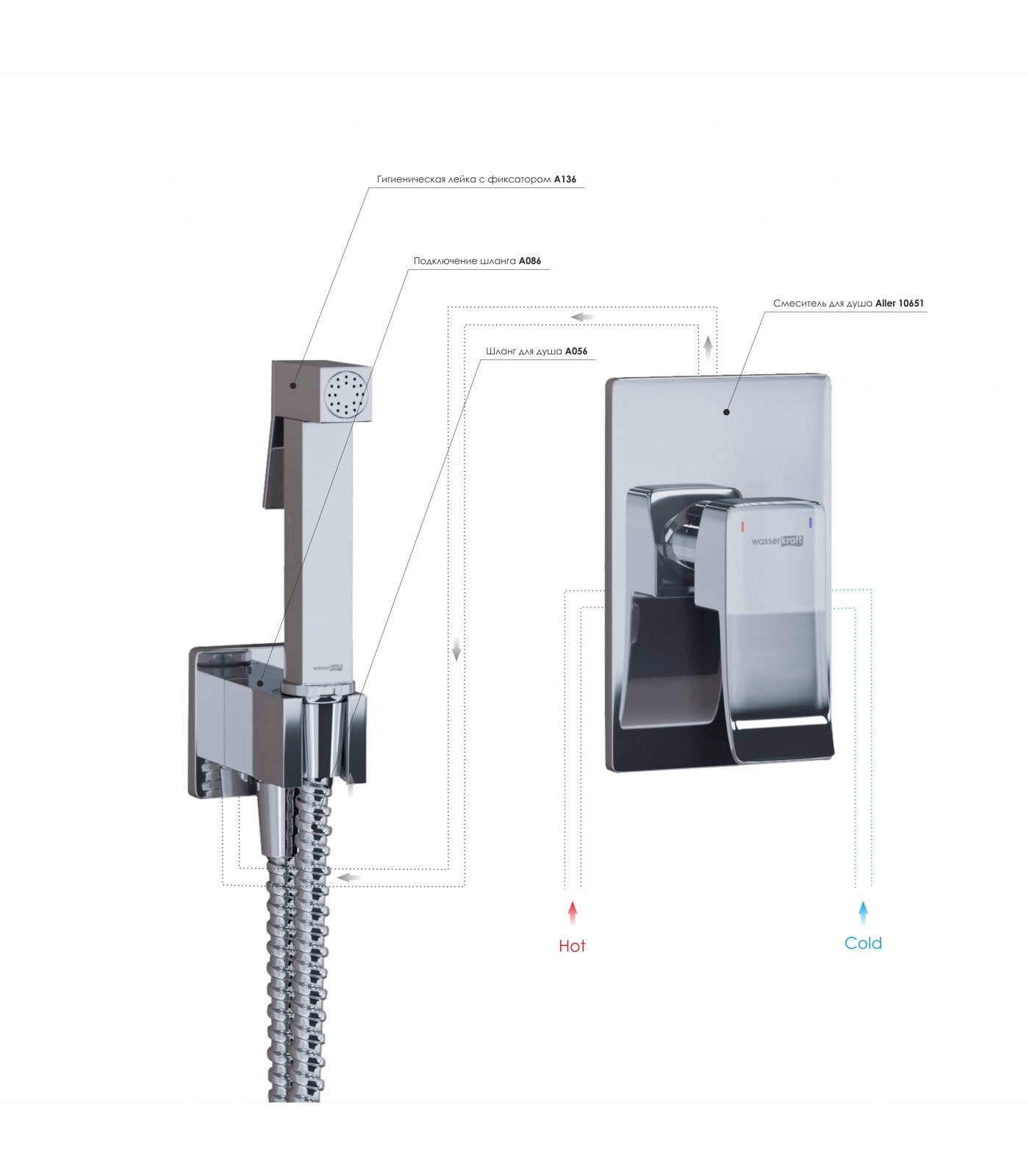 Смеситель для душа Aller 10651, Подключение шланга A086, Шланг для душа 1000 мм А056, Гигиеническая лейка с фиксатором А136