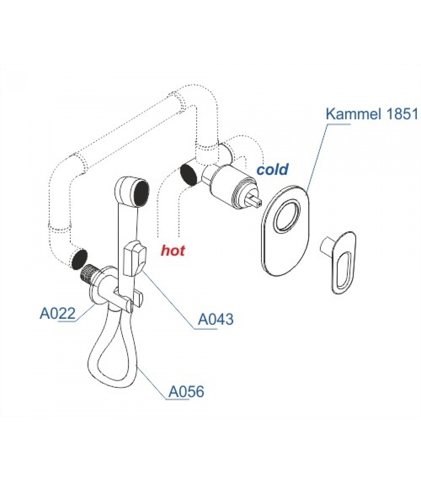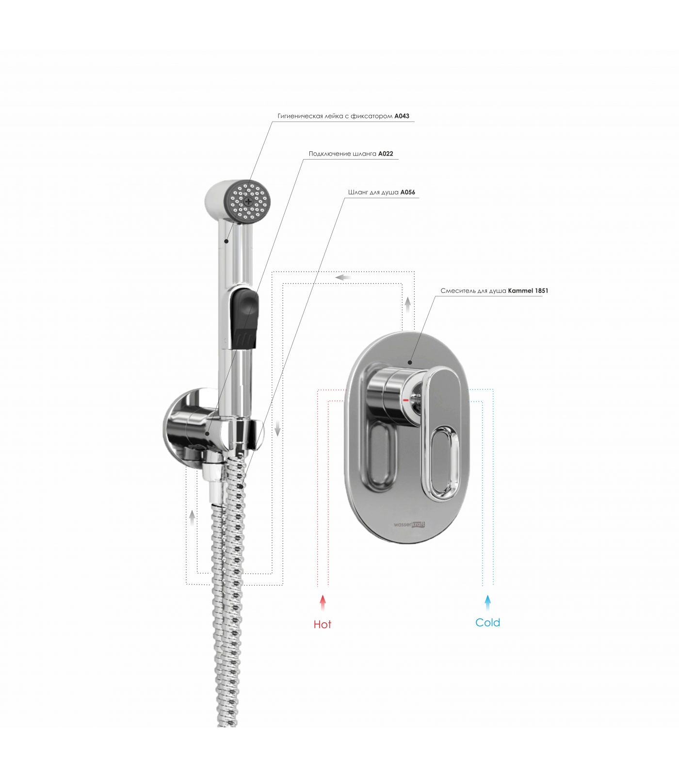 Смеситель для душа Kammel 1851 , Подключение шланга A022, Шланг для душа 1000 мм А056, Гигиеническая лейка с фиксатором A043
