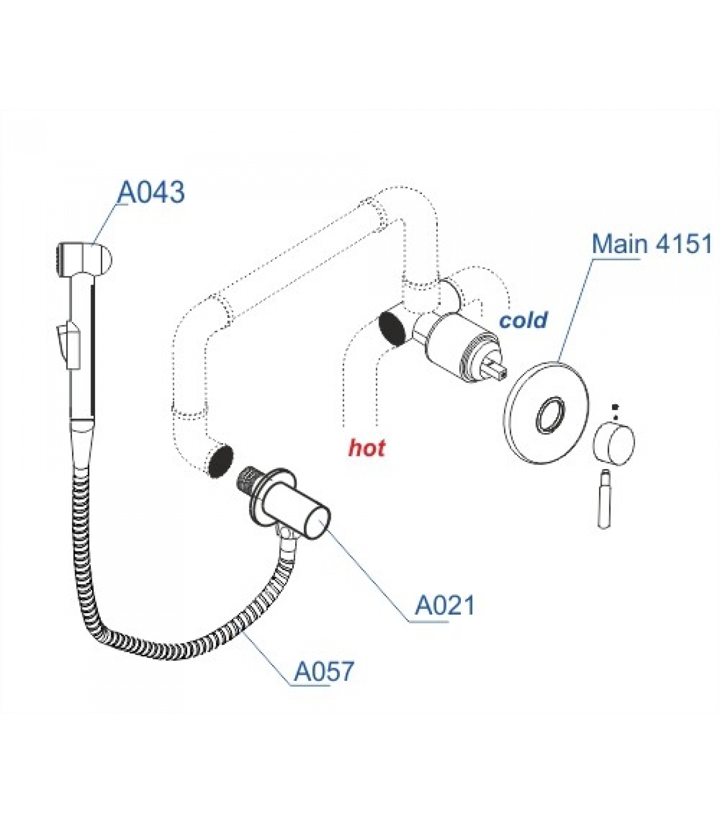 Смеситель для душа Main 4151, Подключение шланга A021, Шланг для душа 1200 мм А057, Гигиеническая лейка с фиксатором A043