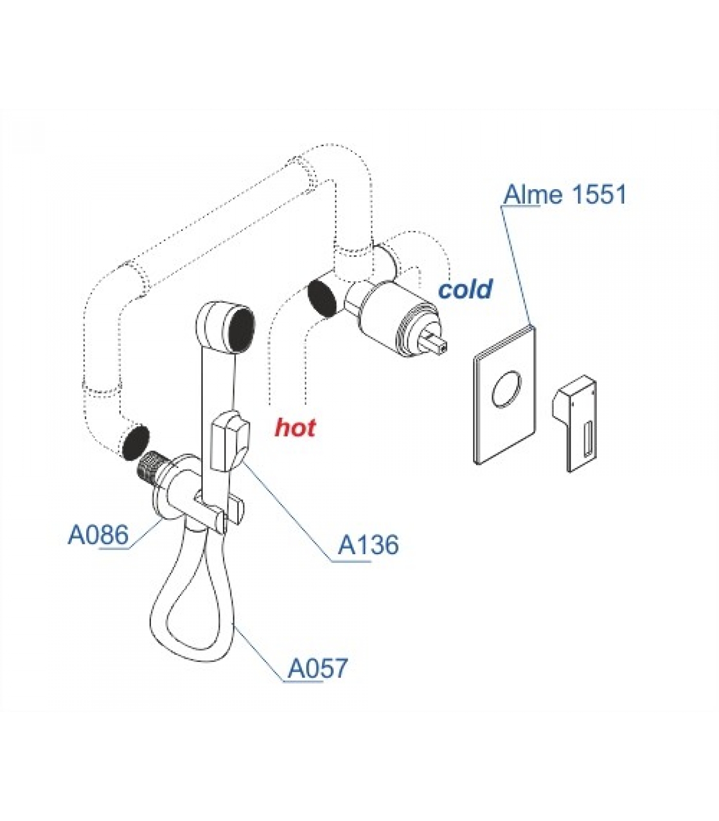Смеситель для душа Alme 1551, Подключение шланга A086, Шланг для душа 1200 мм А057, Гигиеническая лейка с фиксатором А136