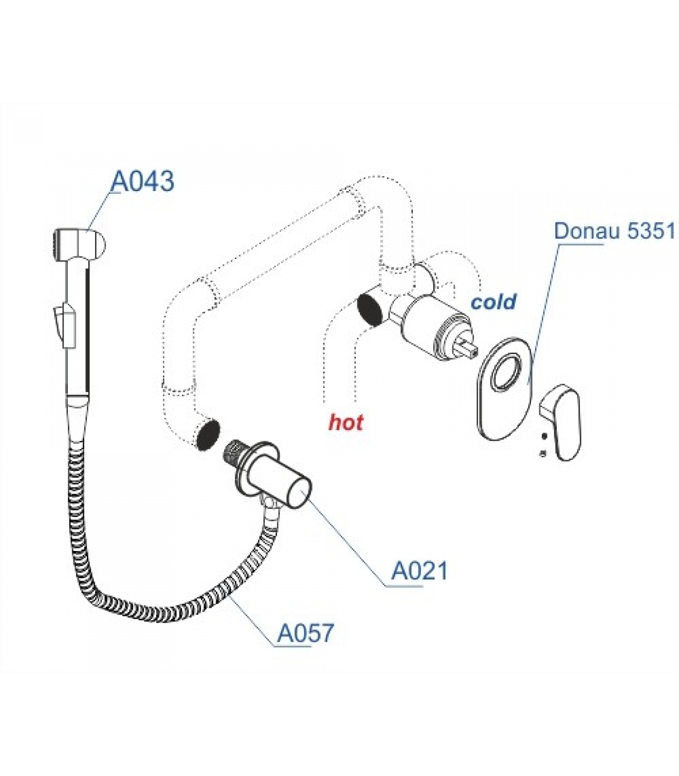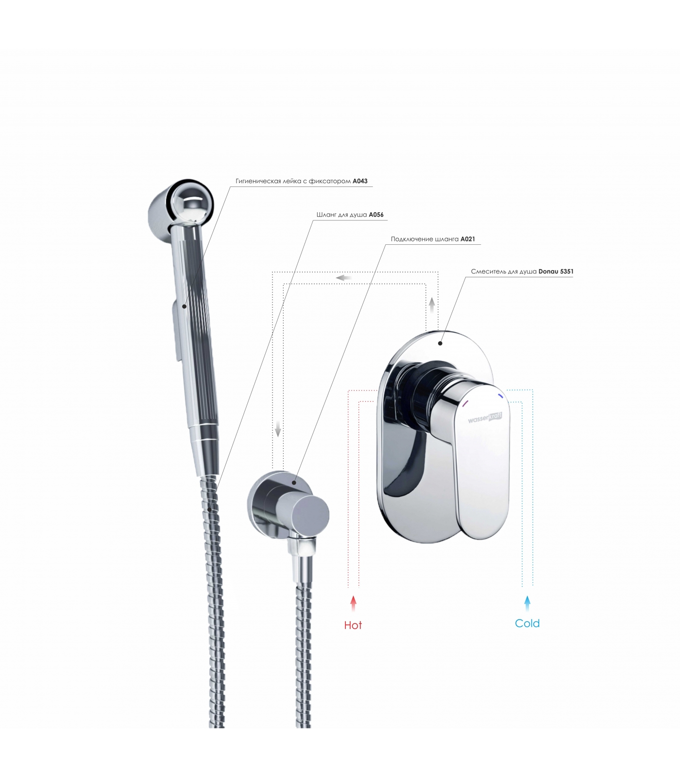 Смеситель для душа Donau 5351, Подключение шланга A021, Шланг для душа 1200 мм А057, Гигиеническая лейка с фиксатором A043