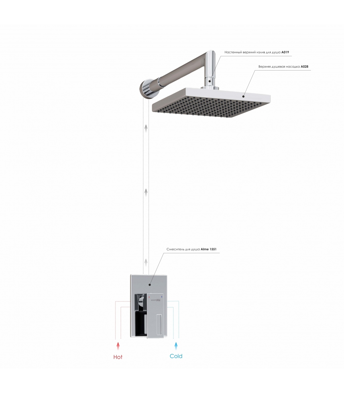 Смеситель для душа Alme 1551, Верхняя душевая насадка A028, Верхний излив для душа A019