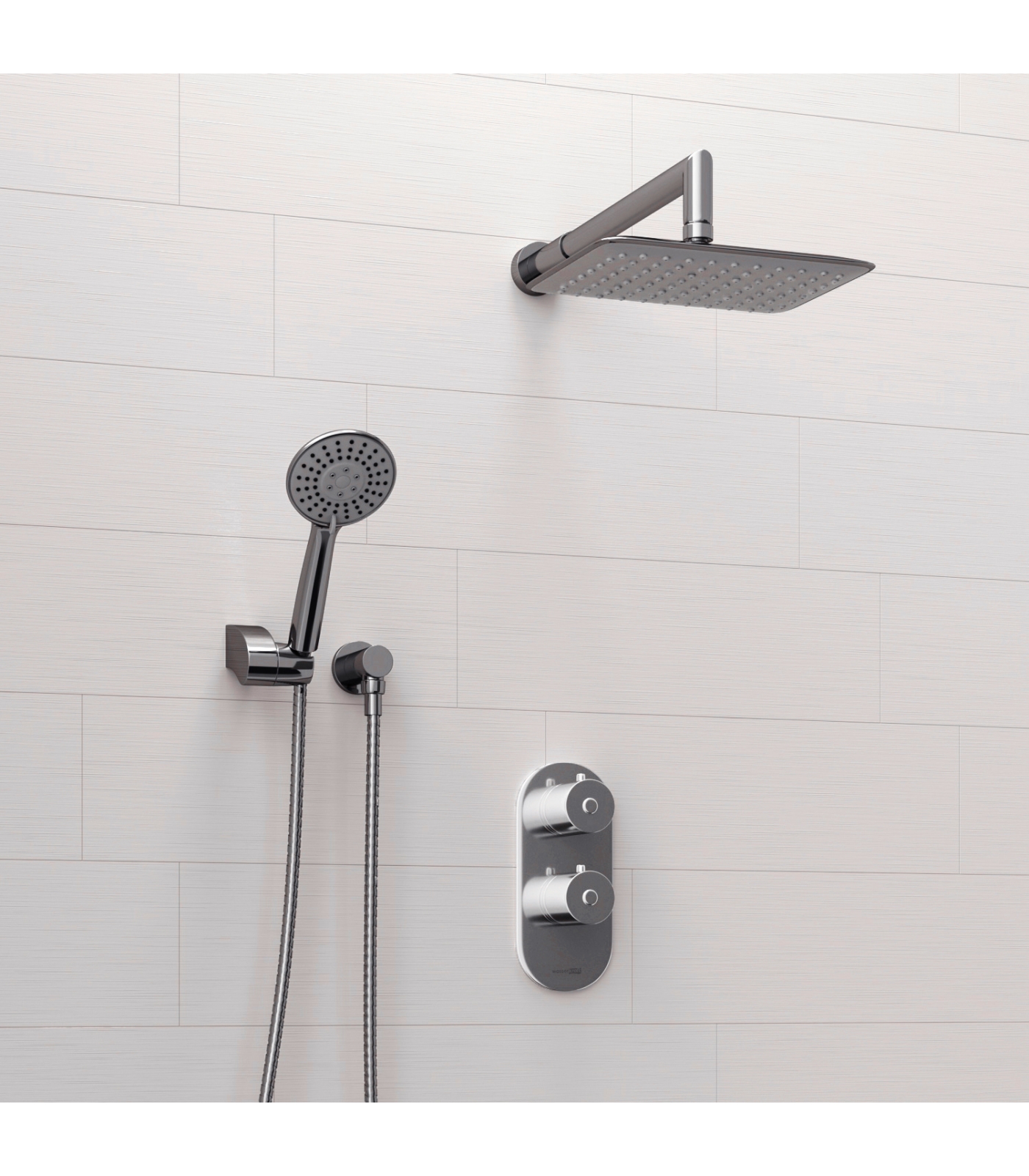 Термостатический картридж Vernet (Франция), Керамический поворотный переключатель на душ Fl?hs (Германия), Обратный клапан Neoperl, Душевая насадка 250х190 мм, 88 форсунок, ABS-пластик, Лейка 3-функциональная с системой защиты от известковых отложений, Комплект скрытого монтажа, Наружная часть смесителя