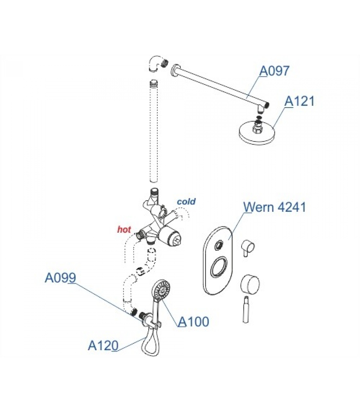Смеситель для ванны и душа Wern 4241, Подключение шланга A099, Шланг для душа 1500 мм А100, Верхняя душевая насадка A121, Верхний излив для душа A097, Лейка 3-функциональная A120