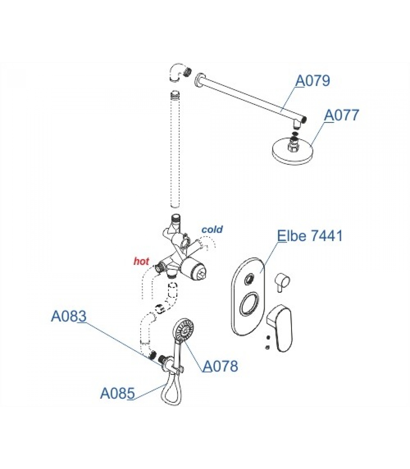 Смеситель для ванны и душа Elbe 7441, Подключение шланга A083, Шланг для душа 1500 мм А085, Верхняя душевая насадка A077 , Настенный верхний излив для душа A079 , Лейка 3-функциональная A078, Лейка 3-функциональная A078