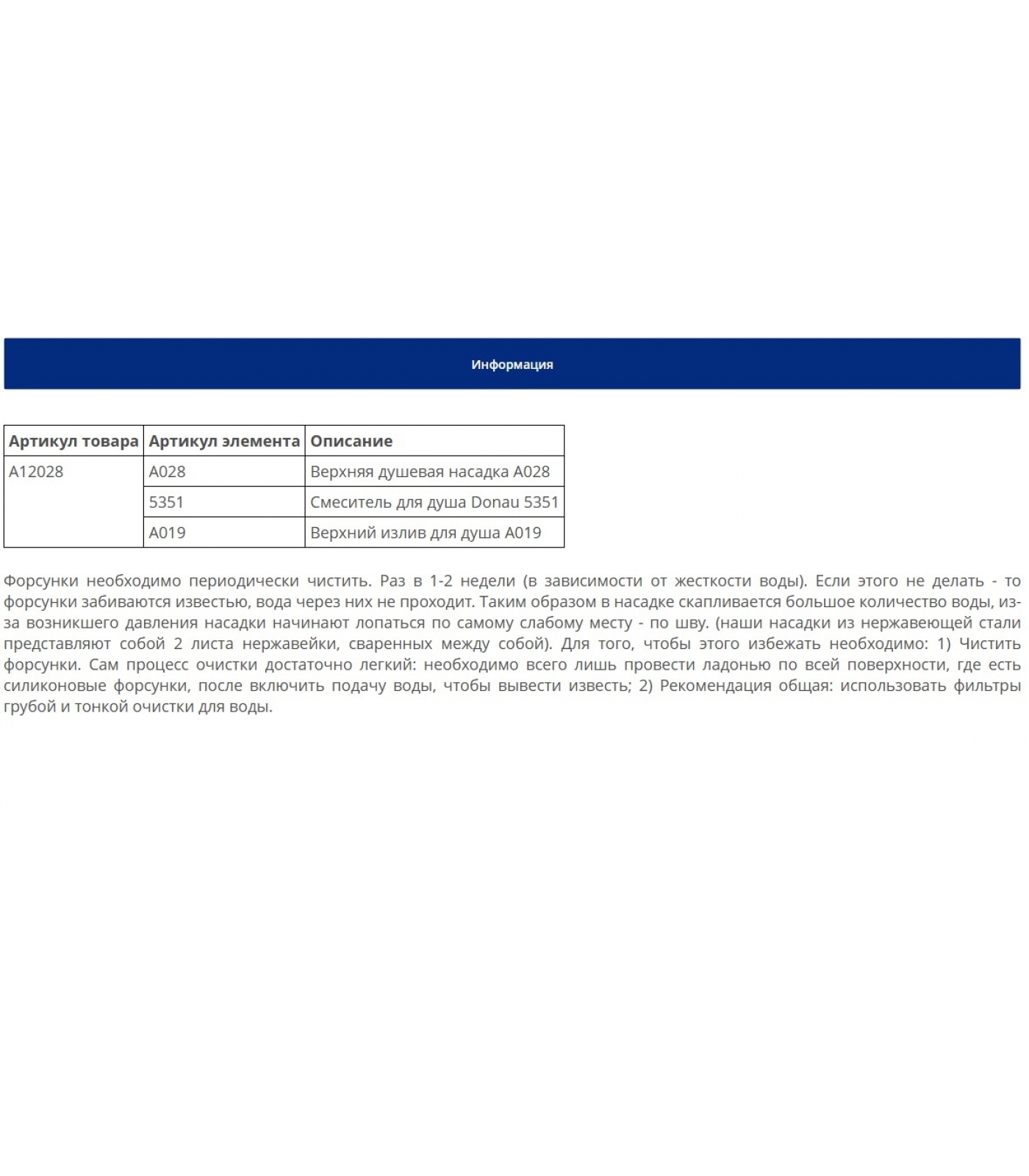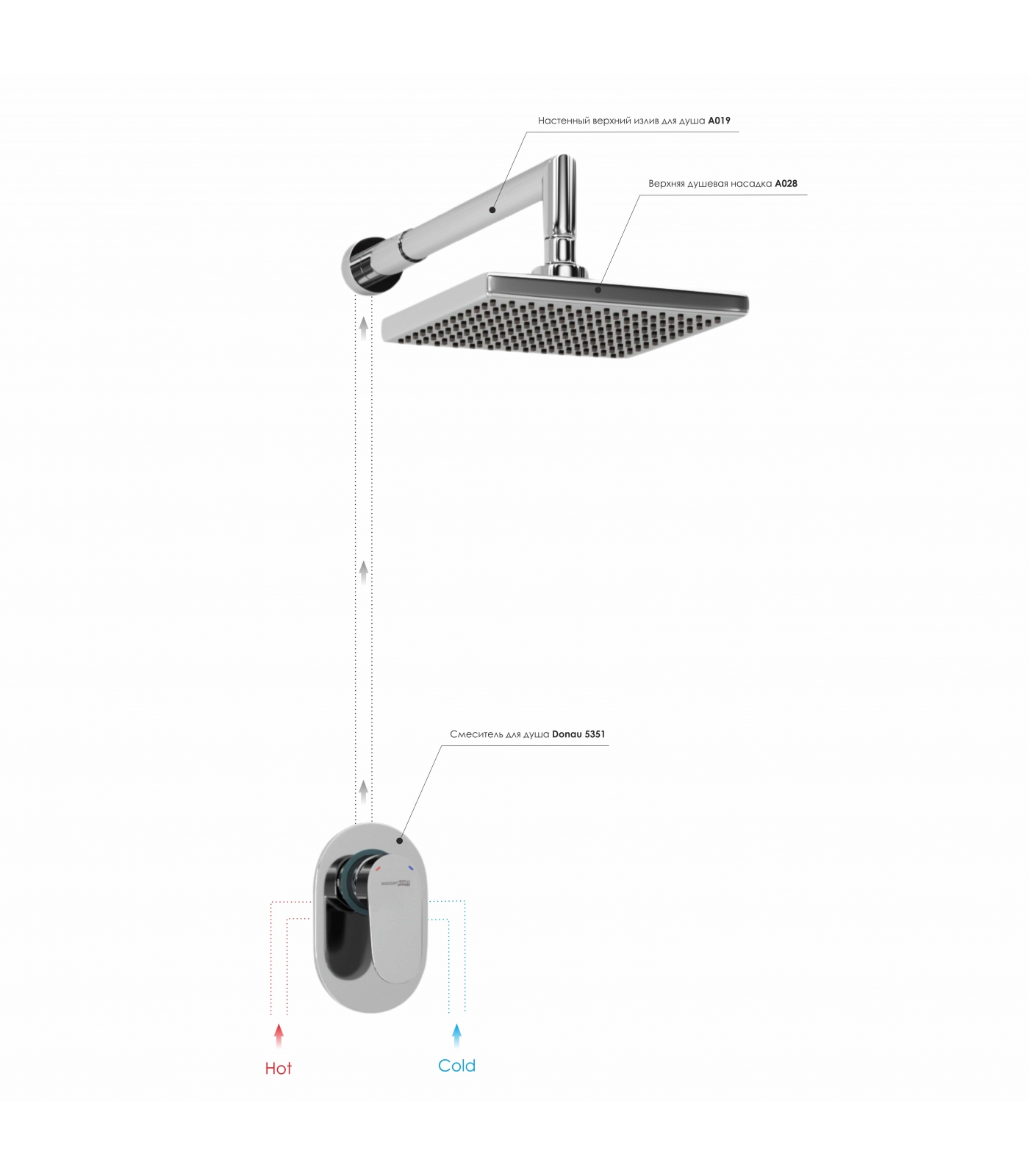 Смеситель для душа Donau 5351, Верхняя душевая насадка A028, Верхний излив для душа A019