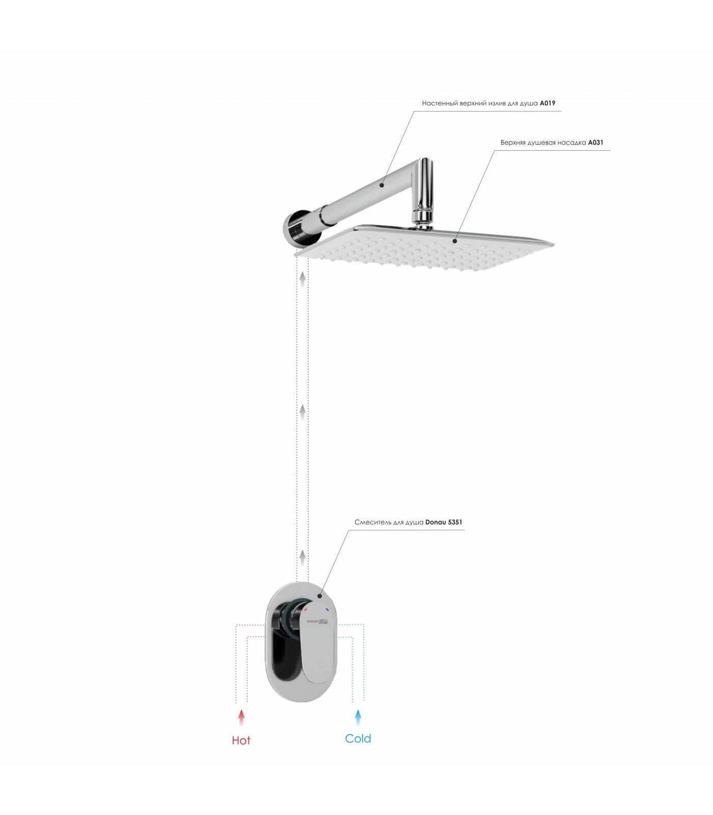 Смеситель для душа Donau 5351, Верхняя душевая насадка A031, Верхний излив для душа A019