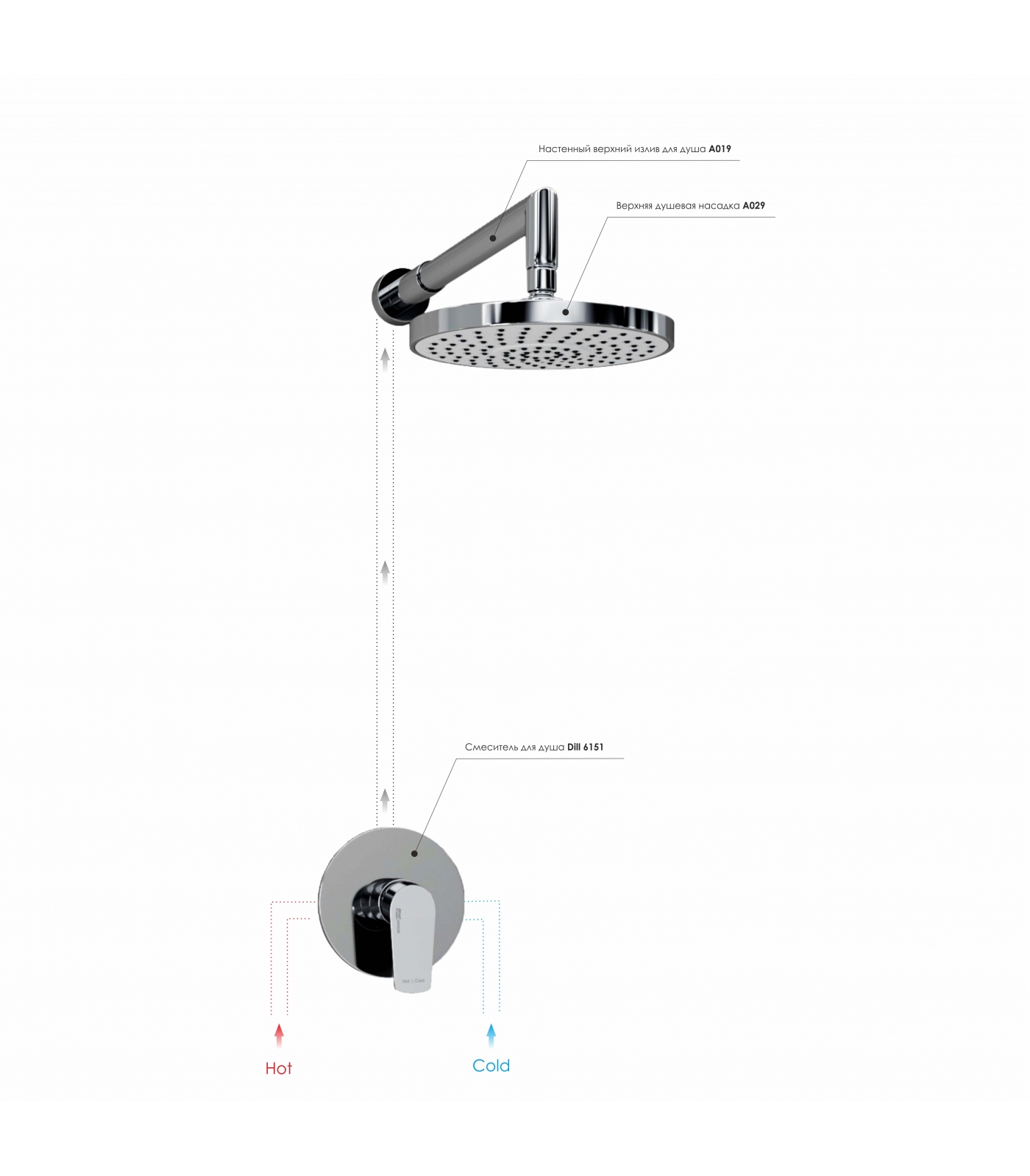 Смеситель для душа Dill 6151, Верхняя душевая насадка A029, Верхний излив для душа A019