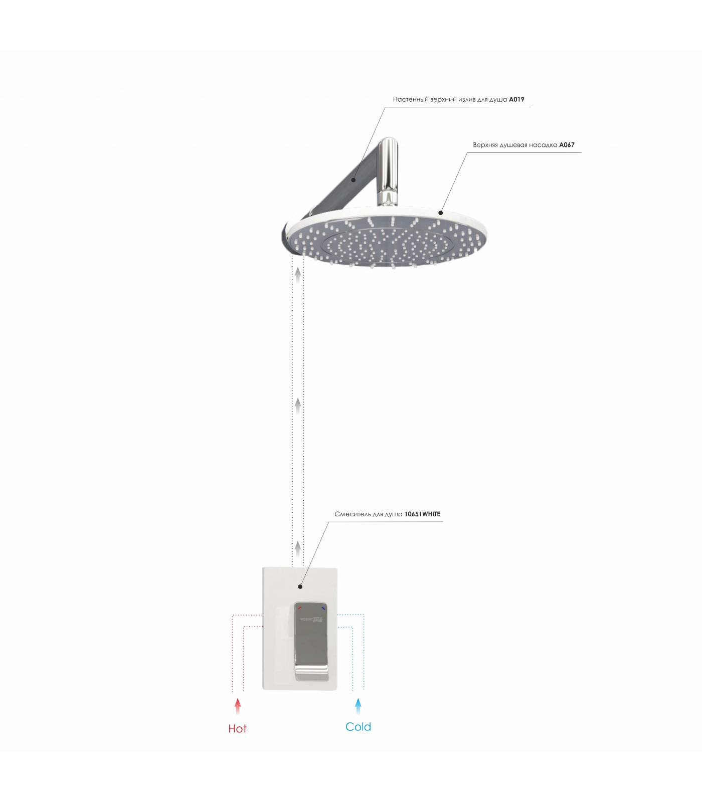 Смеситель для душа Aller 10651WHITE, Верхняя душевая насадка A067, Верхний излив для душа A019