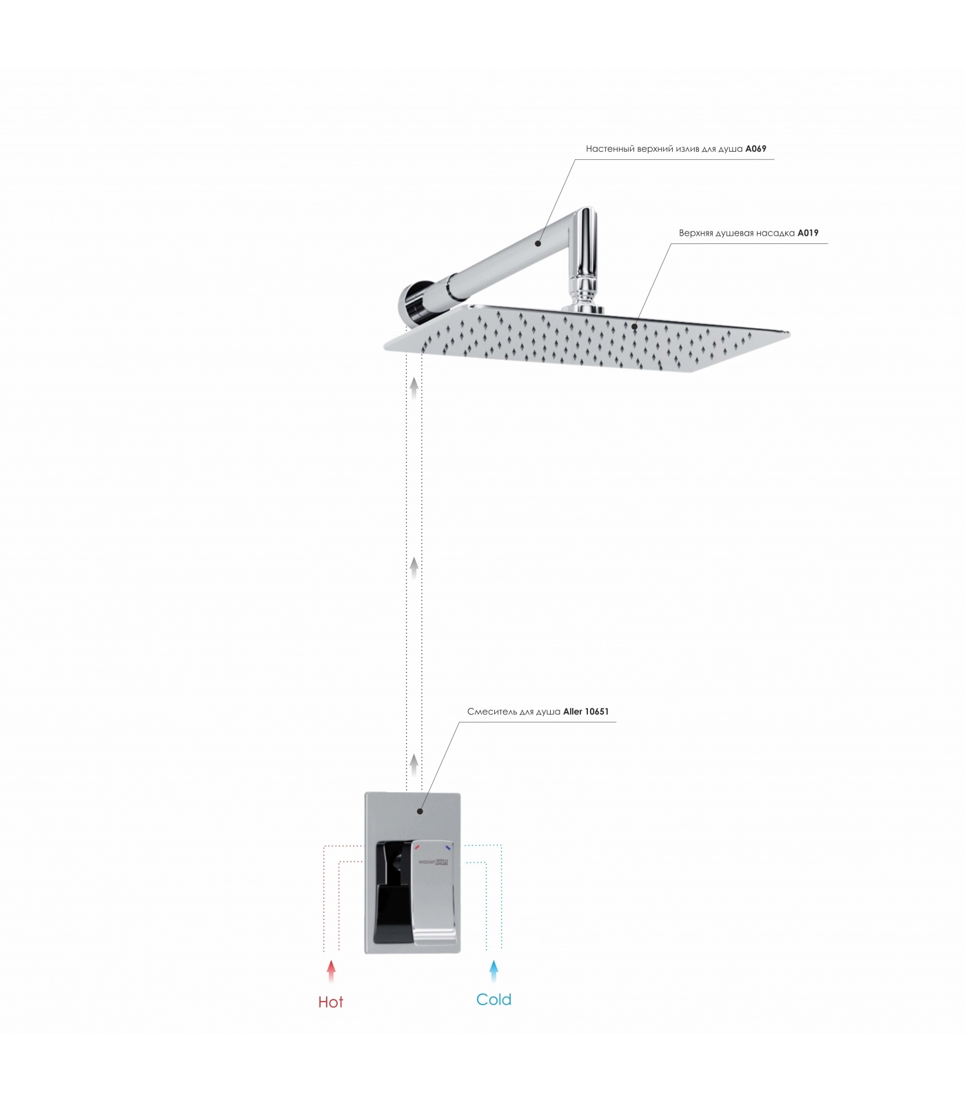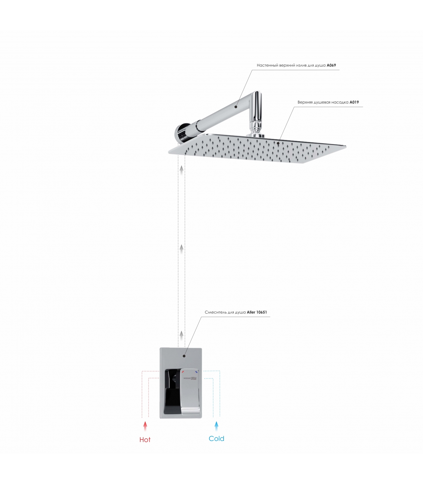 Смеситель для душа Aller 10651, Верхняя душевая насадка A069, Верхний излив для душа A019