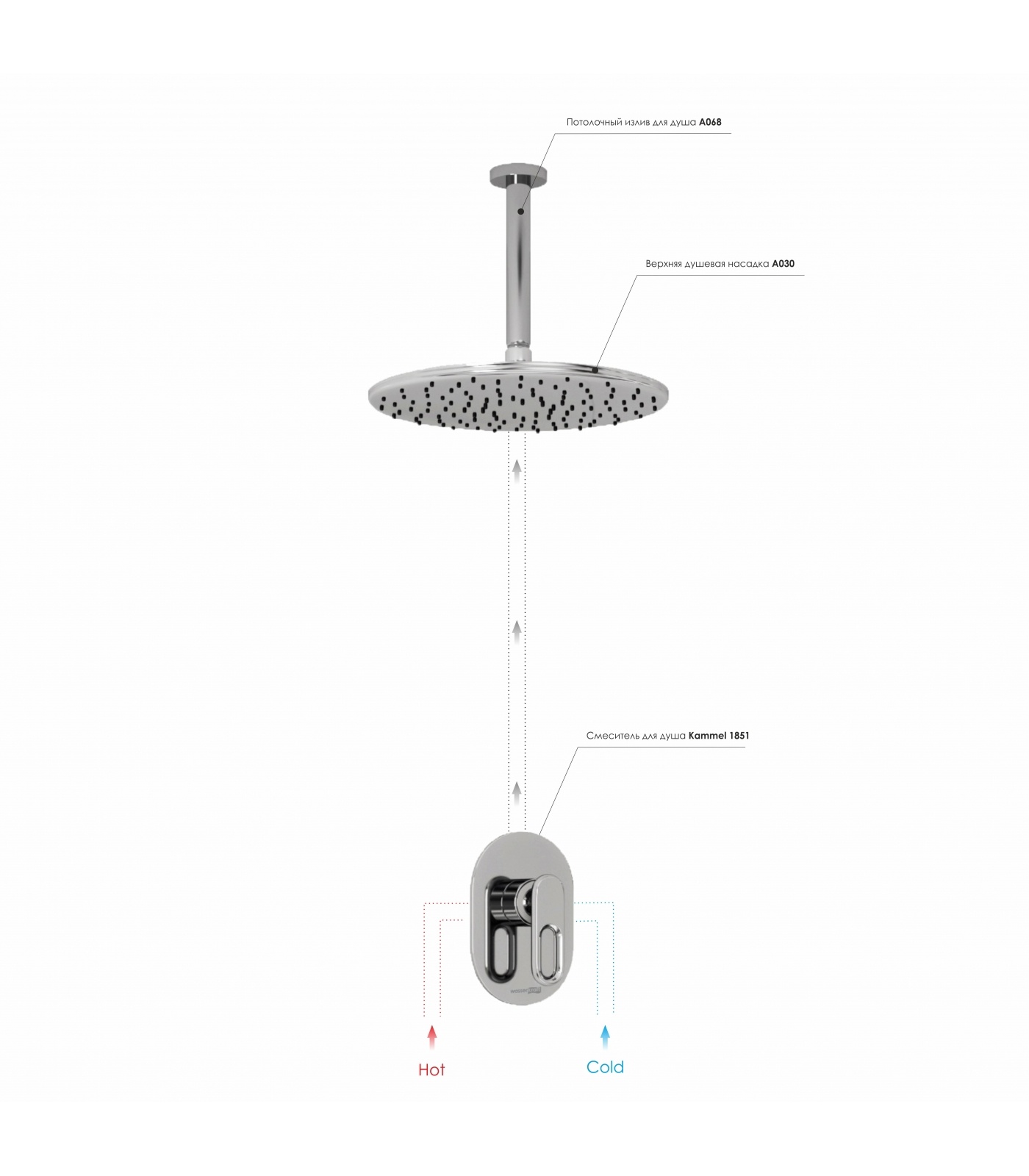 Встраиваемые комплекты Керамический картридж 35мм, Sedal (Испания), Комплект скрытого монтажа, Наружная часть смесителя, Душевая насадка ? 250 мм, 135 форсунок, ABS-пластик Смеситель для душа Kammel 1851 , Верхняя душевая насадка A030, Потолочный излив для душа A068 латунь, хромоникелевое покрытие, ABS-пластик 5 лет.