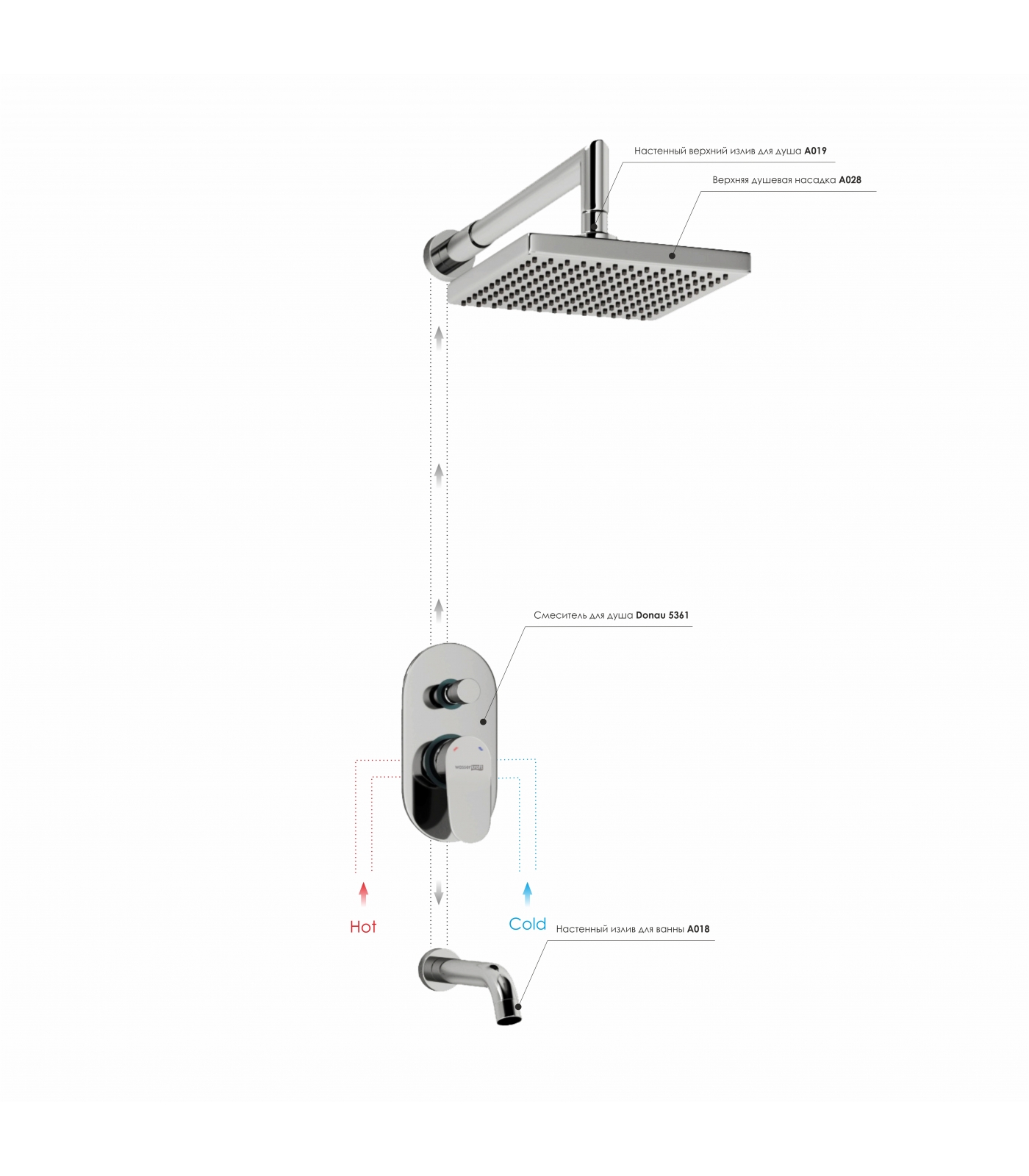 Смеситель для ванны и душа Donau 5361, Верхняя душевая насадка A028, Верхний излив для душа A019, Настенный излив для ванны A018