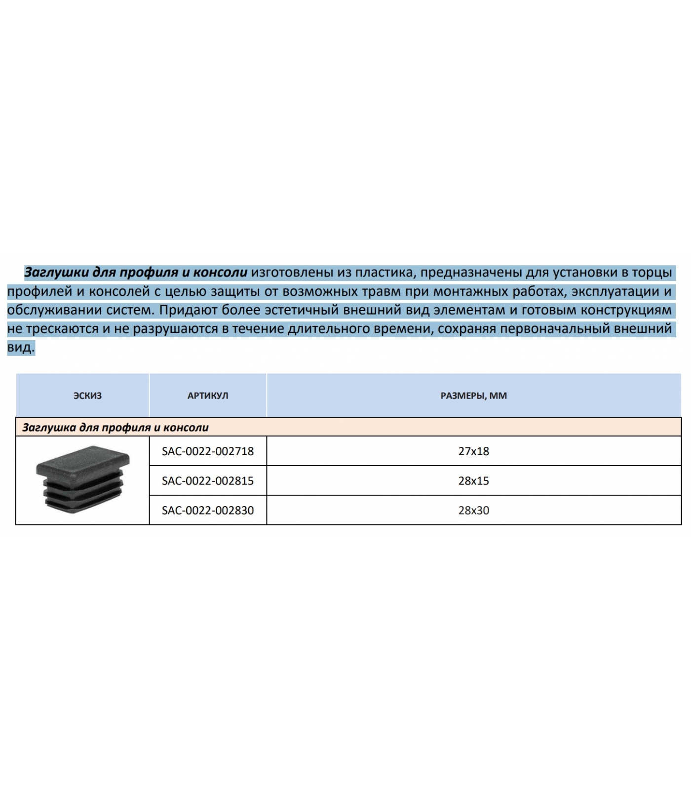 Заглушки для профиля и консоли изготовлены из пластика, предназначены для установки в торцы профилей и консолей с целью защиты от возможных травм при монтажных работах, эксплуатации и обслуживании систем. Придают более эстетичный внешний вид элементам и готовым конструкциям не трескаются и не разрушаются в течение длительного времени, сохраняя первоначальный внешний вид.