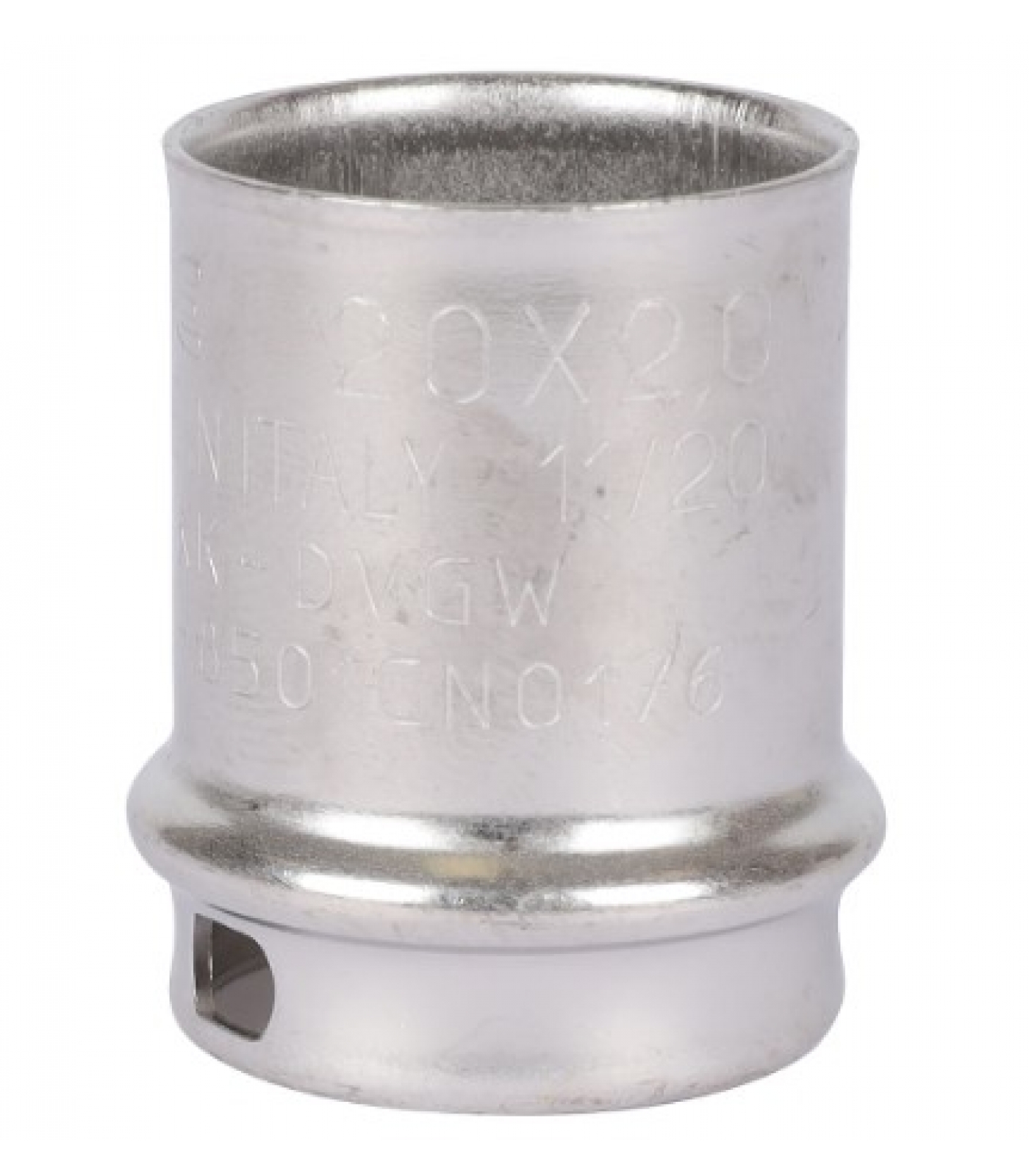 Материал гильзы – пластичная нержавеющая сталь. Конструкция фиксатора обеспечивает правильное расположение пресс-насадки инструмента на соединителе, контроль полноты одевания металлополимерной трубы на штуцер.