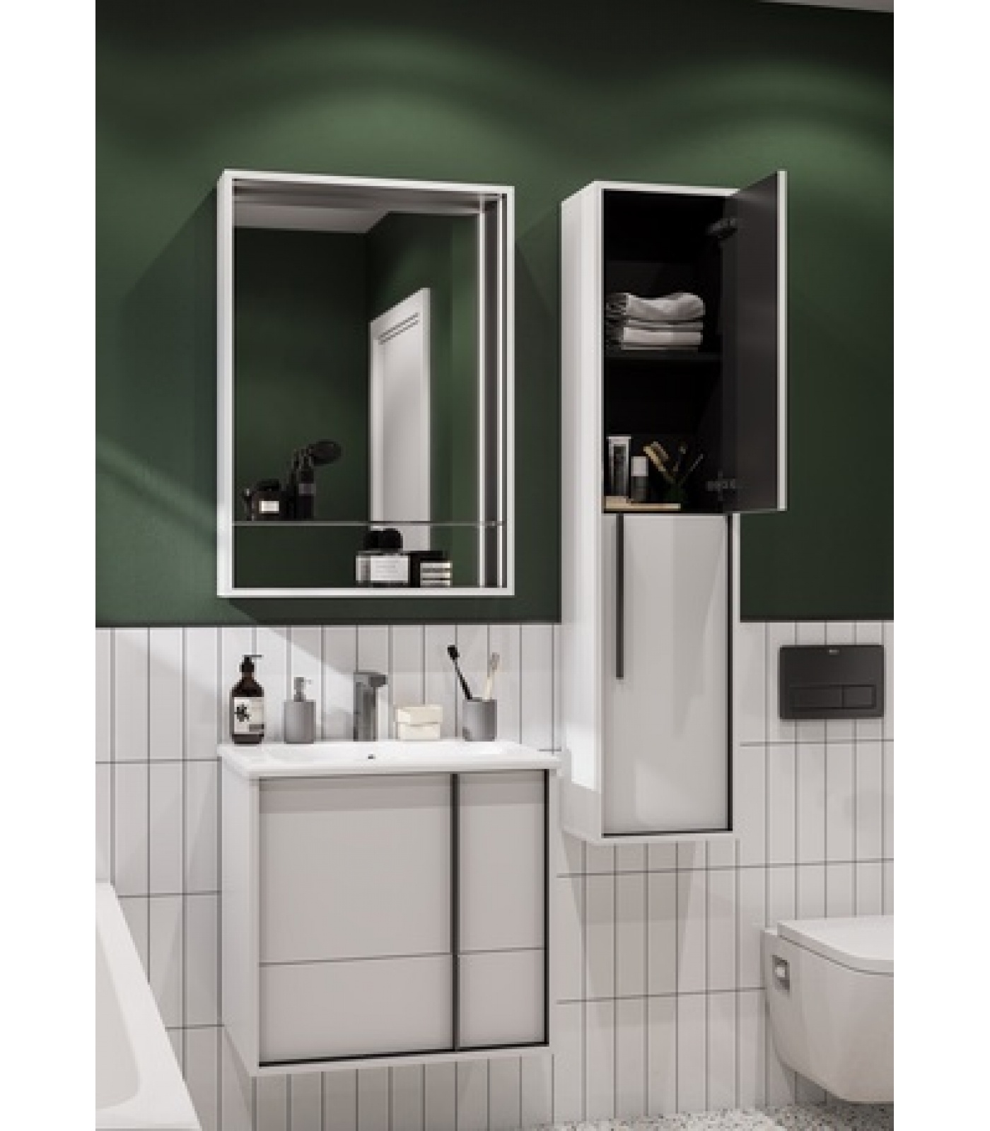 Корпус зеркального шкафа Ривьера 60 от бренда AQUATON выполнен из чёрной МДФ в белой матовой пленке, что позволяет создать яркий цветовой контраст чёрного и белого. Плёнка позволяет надежно защитить мебель от воздействия влажной среды ванной комнаты. В боковые стенки интегрированы LED-светильники. Зеркальный шкаф комплектуется полкой из затемнённого стекла с фиксаторами, которые помогут избежать случайного опрокидывания. Модель идеально дополняет тумбу под раковину AQUATON Ривьера 60.
