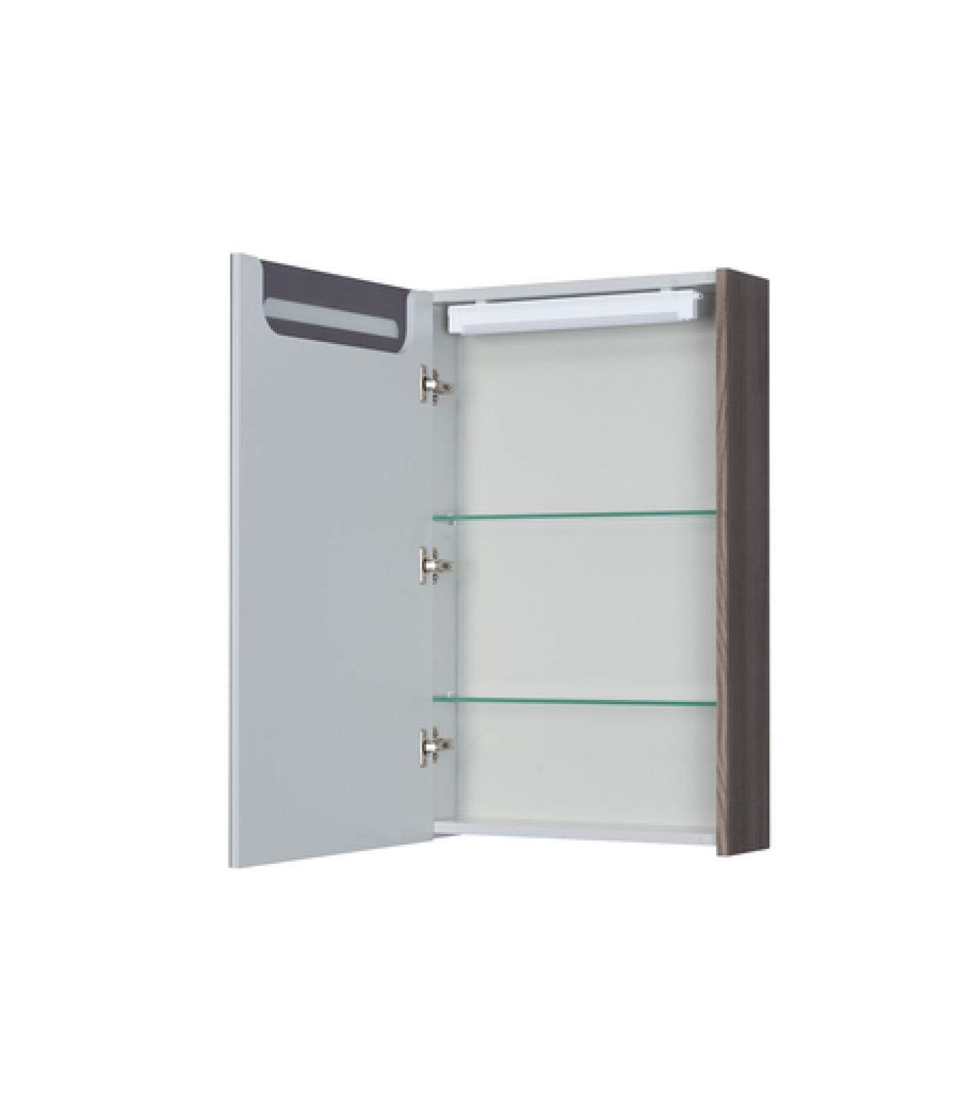 Компактный зеркальный шкаф Сильва 50 от AQUATON в эффектной отделке "дуб макиато" - оптимальное сочетание практичности, утонченной красоты древесных мотивов и современного дизайна. Фасады с зеркальной отделкой и корпус выполнены из влагостойкой ЛДСП. Шкаф оснащён двумя стеклянными полками и LED-подсветкой. Плавное закрывание дверцы обеспечивают петли с доводчиком. Данная модель прекрасно впишется в скандинавский стиль, минималистичный лофт или хай-тек.