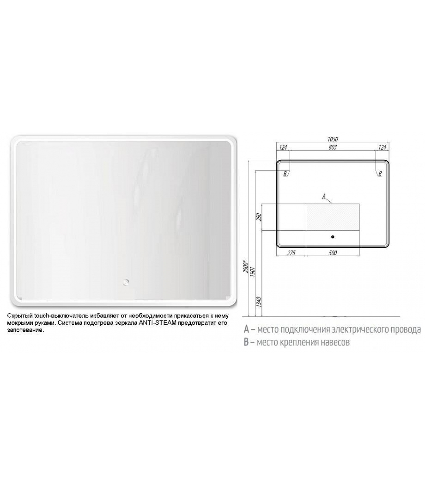Зеркало с фацетом по периметру украшено декоративной LED-подсветкой и оснащено изящным touch-выключателем, встроенным за зеркальным полотном. Touch-выключатель работает от легкого прикосновения и удобно расположен в нижней части зеркала по центру. Алюминиевый каркас обеспечивает легкость конструкции. Зеркало также оснащено системой ANTI-STEAM, которая предотвращает его запотевание.